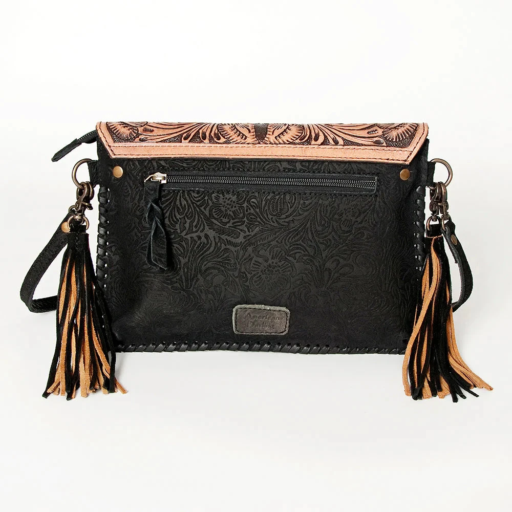 This is such a classy looking purse! The sculpted black leather with the light tan tooled leather top is a standout!!