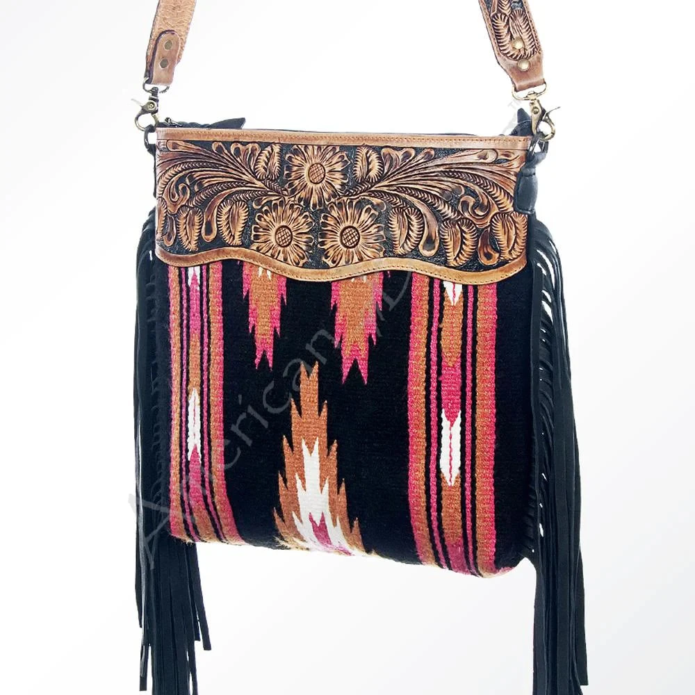 This bag will make you pretty in pink! It is really bold with the hot pink & black Aztec print along with the tooled top, it will make heads turn!