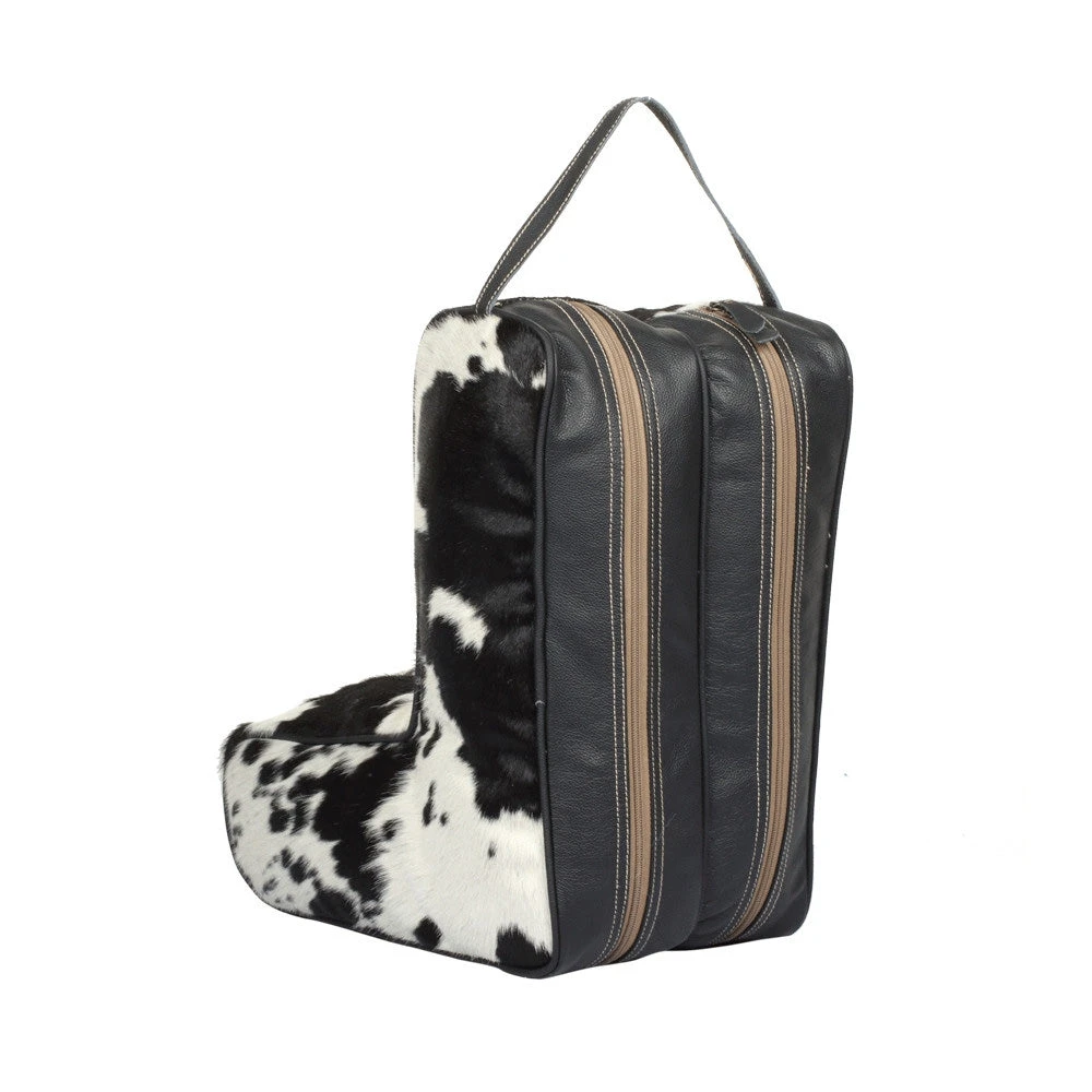 Boot bags are great for packing things in your luggage! Boot your boots in here so you don’t dirty fancy clothing! The black and white hide is authentic and perfect for every western gal!