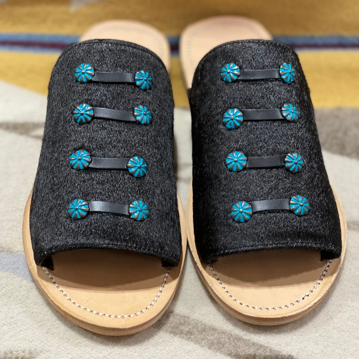 These black cowhide sandals are accented with turquoise studs to make these sandals stunning and unique. Perfect this summer to accentuate an outfit.