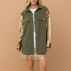 For a day or night look, you can’t go wrong selecting this cargo twill jacket. The sequin detail gives a fun twist to an everyday jacket that you will look great in!