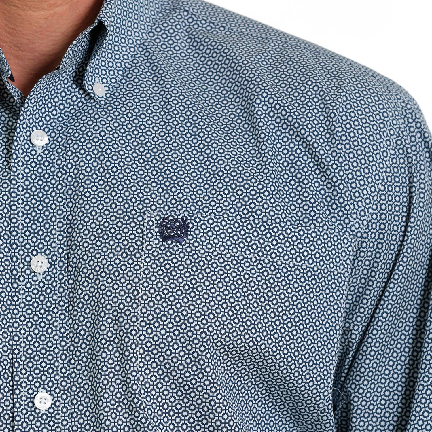This long sleeved shirt with navy, grey and white geo print looks great with your favorite pair of jeans. Just the right style with a whole bunch of fun.