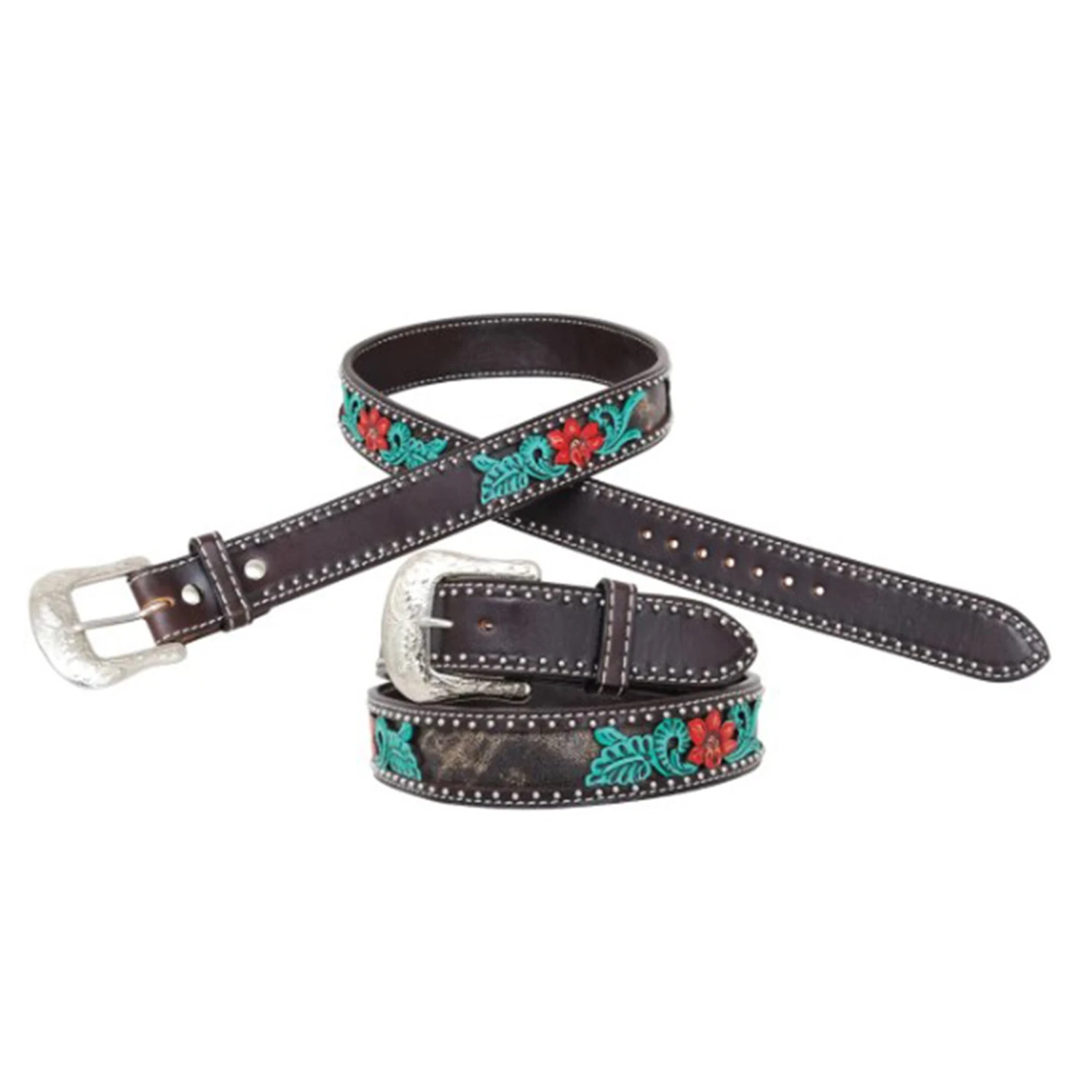Look at this super cute cactus flower belt made by Circle Y. The outline of this belt has silver studs but the real eye catcher is the red flowers with green leaves.