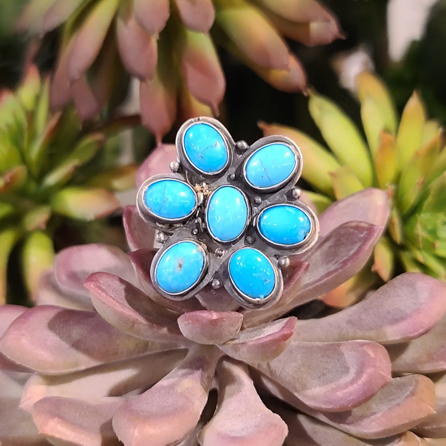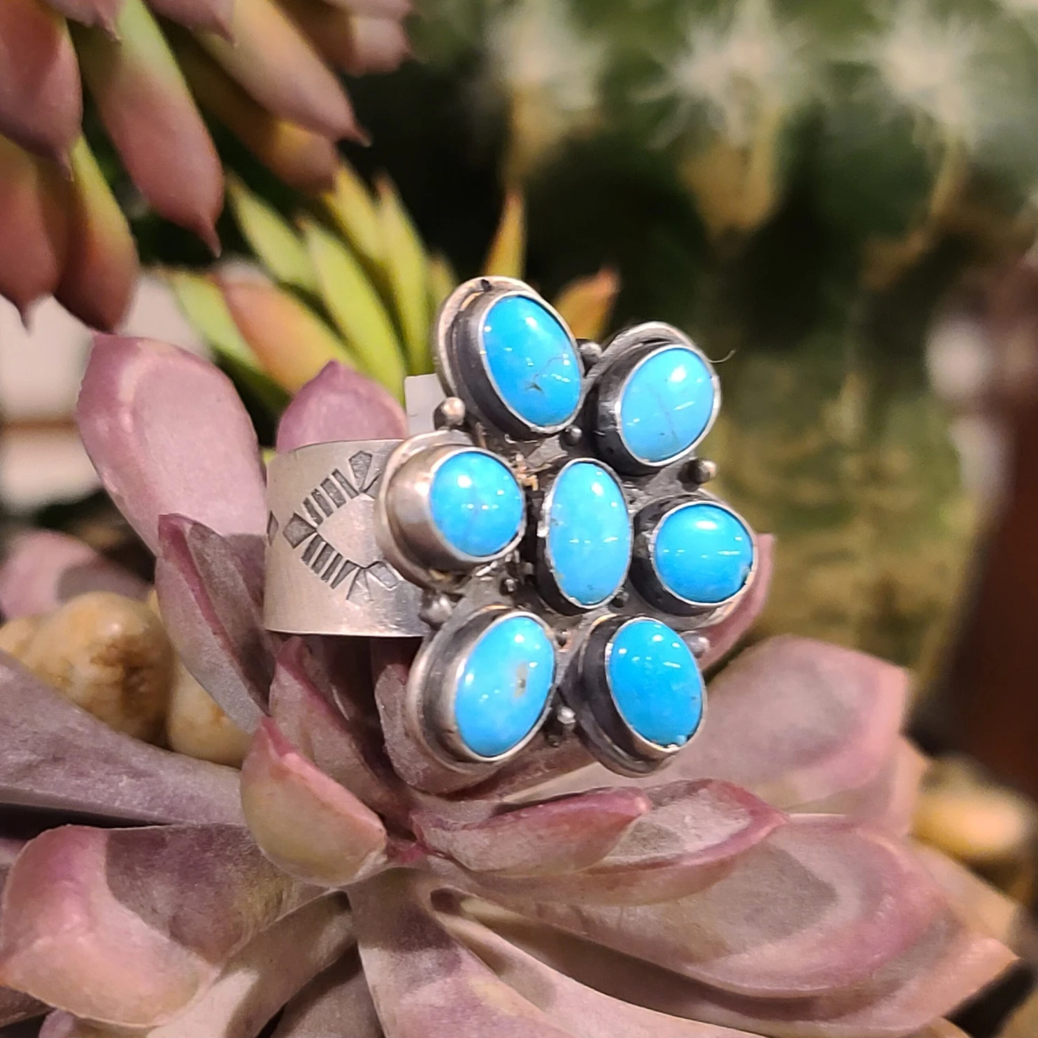 This is a great medium size ring that has stunning Kingman Turquoise stones. The flower burst ring is 1 inch in diameter Has a great Aztec pattern all the way around the band.