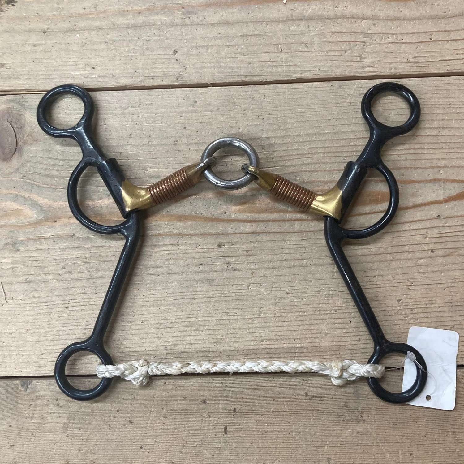 Mouthpiece: Medium severity, three piece mouth with 1 1/2″ center ring allowing good reach to the outside pressure points of the bars enhancing bend. The center ring works primarily on tongue pressure encouraging flex at the poll, also adding in achieving headset and collection. Has copper wrapped bars.