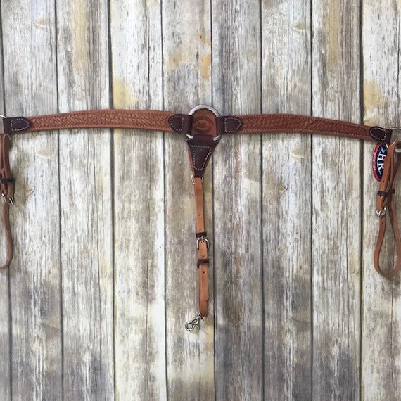 This breast collar showcases the handiwork of HR Saddlery with natural colored basket weave tooling. This breast collar would make a great match for a variety of saddles!
