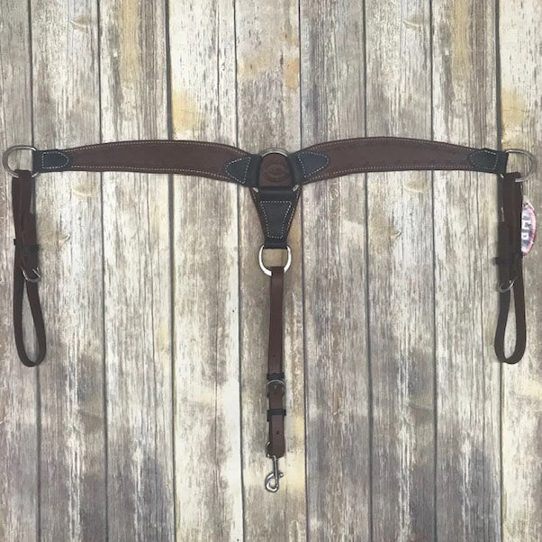 This oiled breast collar features a barbed wire tooled border. The 2 1/2″ width is perfect for versatile breast collar, and the oiled finish keeps the leather soft.