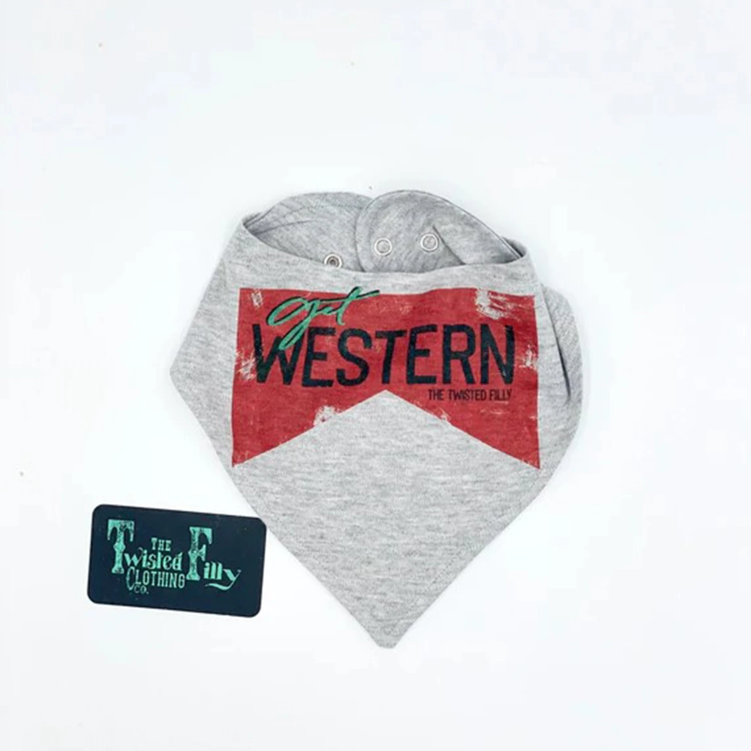 Round up your happy Cowkids stray grub with this one of a kind punchy bandanna style bib. 2 snap adjustable closure for easy and secure use. These bibs are 65% Poly and 30% Cotton and softer than your Mamma’s mashed taters!