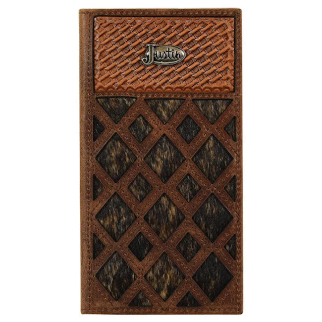 This rodeo wallet has a lot of detail. The diamond pattern has a brindle inlay, and the top of the wallet is tooled in a basketweave with a Justin concho.