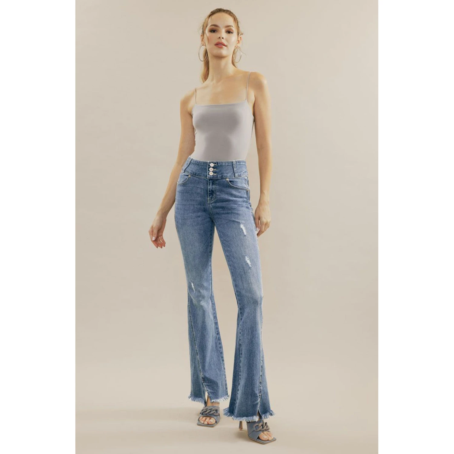 Medium washed flare jeans featuring 3-button front closure, twisted out seam, a hint of distresses, and frayed hem detail.