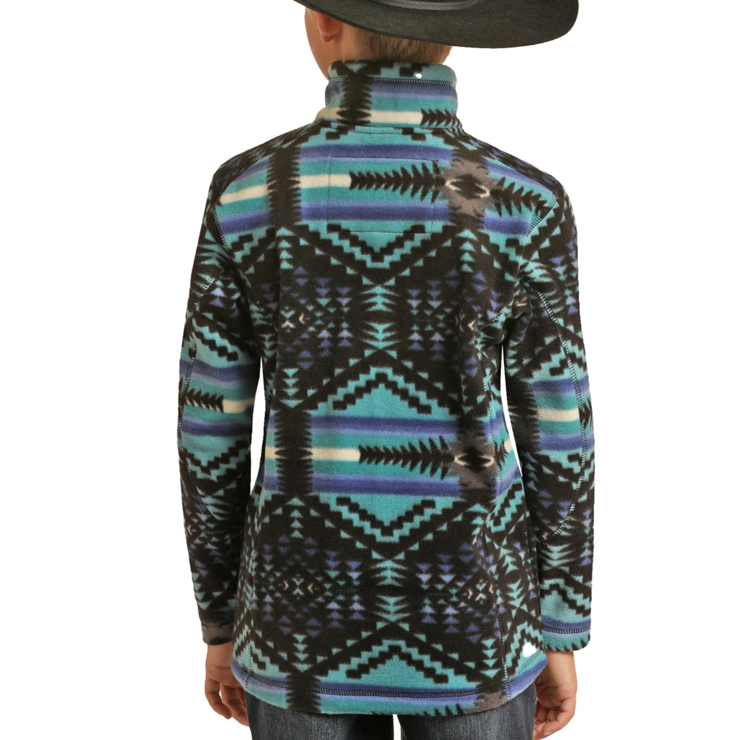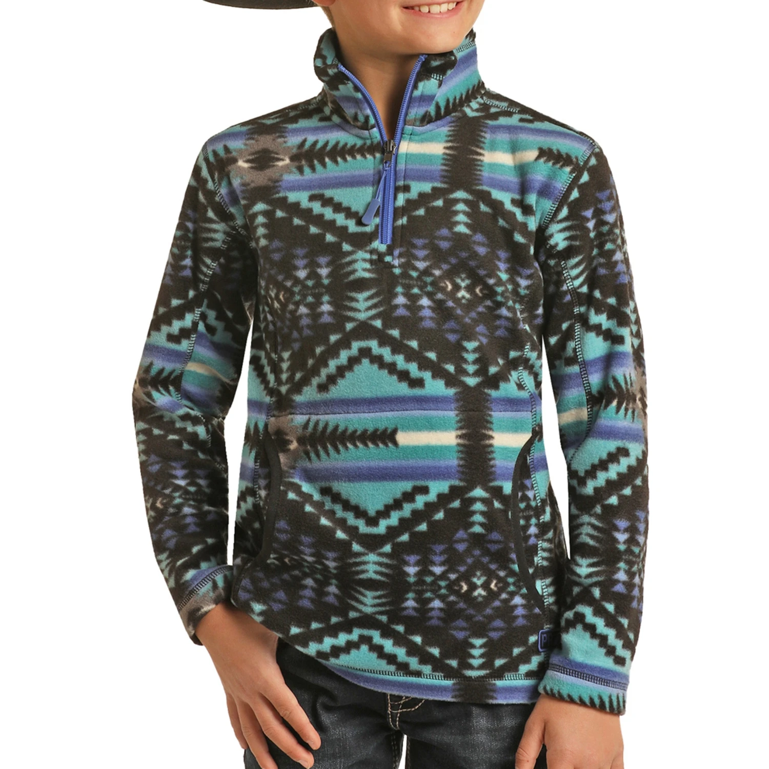 Keep them warm on those cool days with this black and teal pullover. It features a horizontal Aztec pattern, stand up collar with quarter zipper closure and a kangaroo pocket.