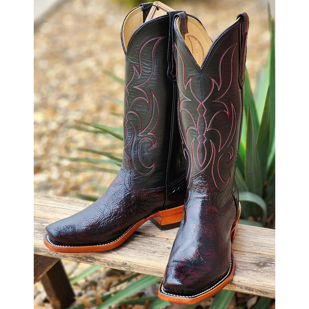 This sharp pair of black cherry smooth ostrich boots are so classy. Sure to become your favorite go to pair. Even the leather soles have a rich color to them that stands out. These boots are perfect for the office or the arena.