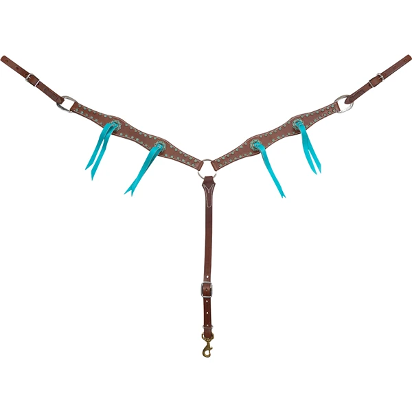This chocolate and turquoise breatcollar from Martin Saddlery features chocolate skirting with antiqued turquoise conchos and turquoise blood knots.