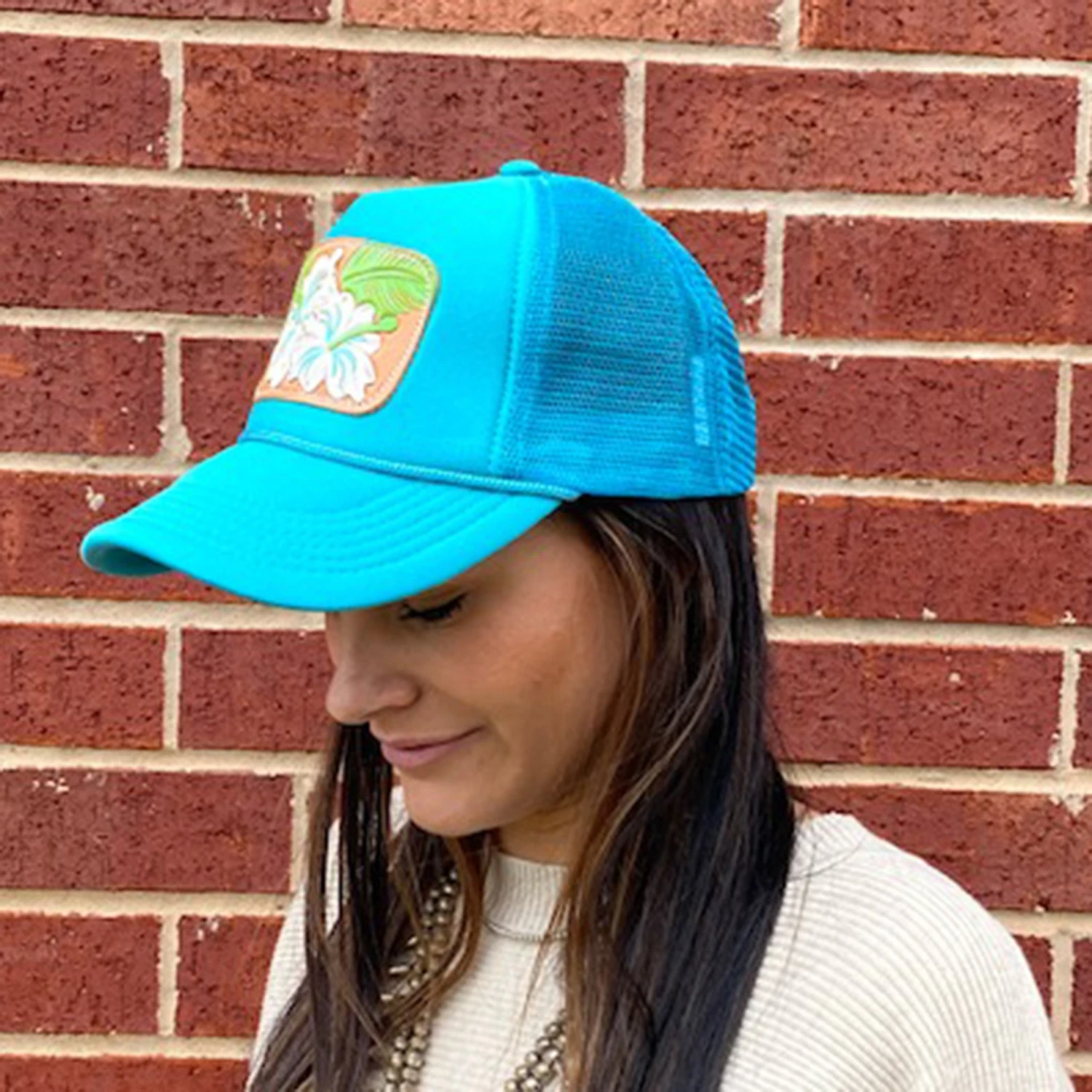 Show off your fun side this Spring & Summer, with this bright turquoise hibiscus Foam Cap!Â