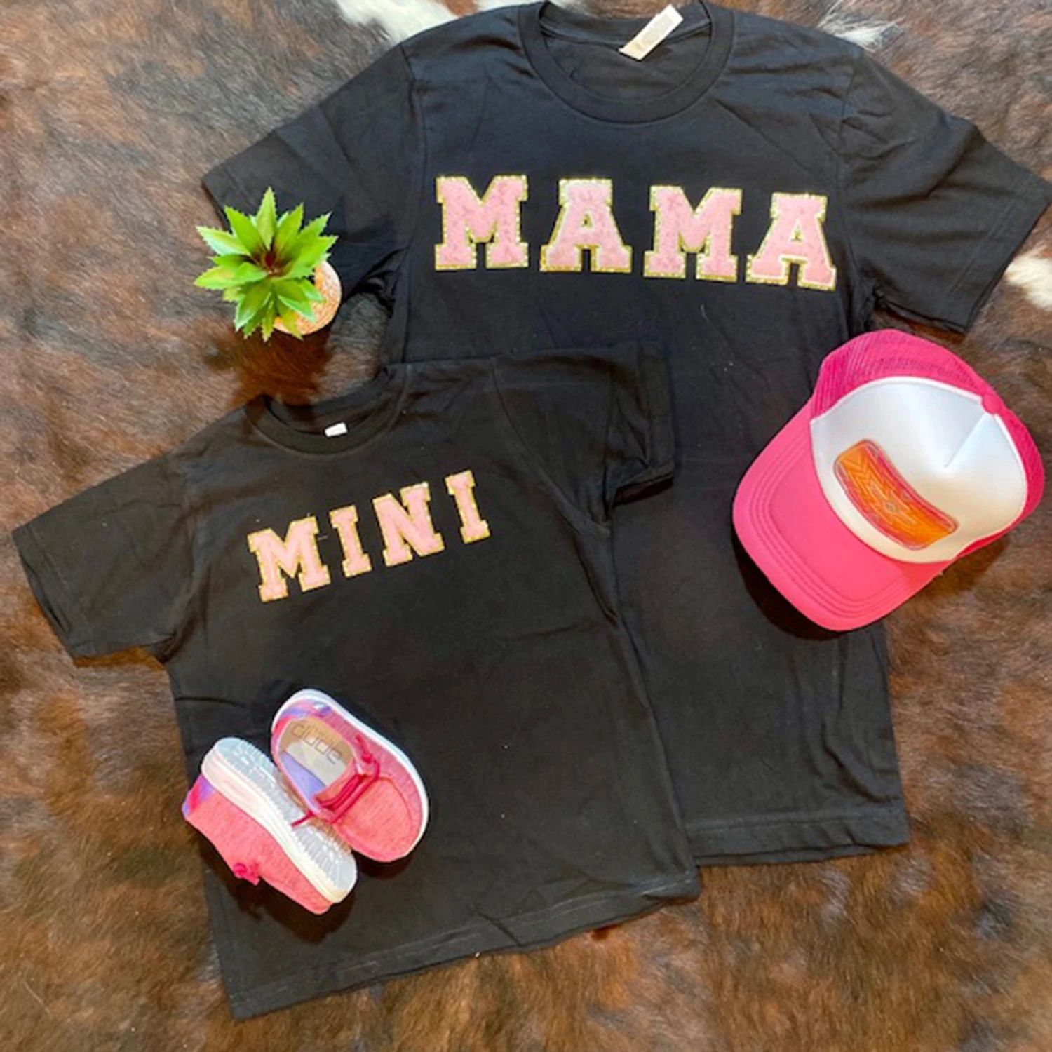 We love a great Mommy & Me and this adorable MINI black tee is a must have! Make sure to grab the matching MAMA version just for you! Pink Letters with Gold Trim, these tee’s are fun and fabulous.