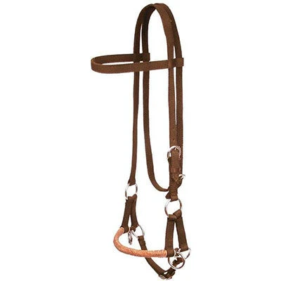 Nylon side pull with a braided rawhide noseband. Durable 3/4″ nylon browband headstall with adjustable chin and a buckle adjustment at the cheek & throat latch.