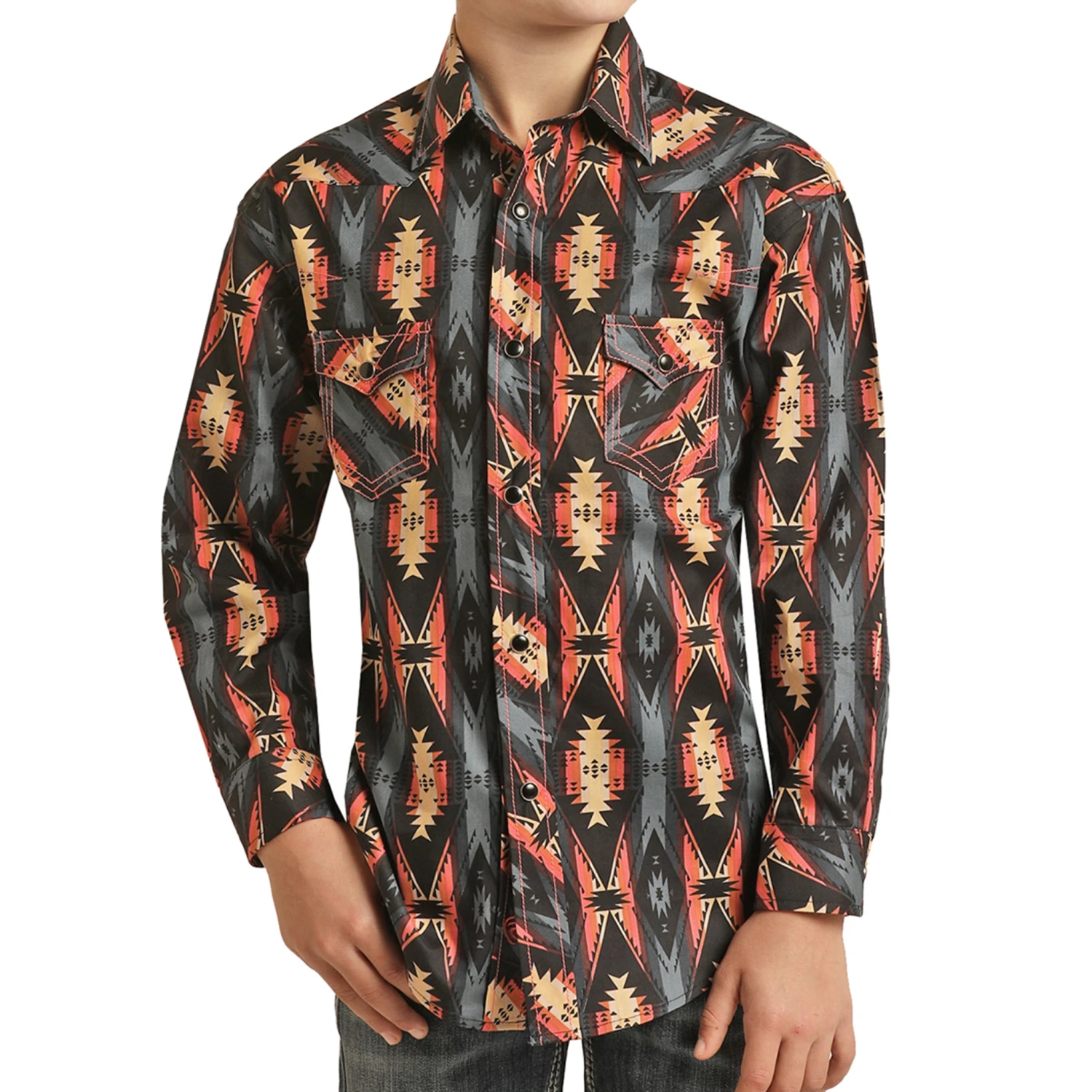 Panhandle Slim brings you this boys southwest style snap long sleeve shirt. This Aztec design includes many peach, yellow, gray and black colors.