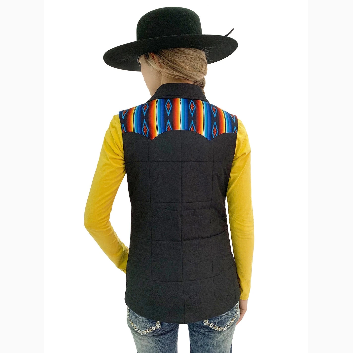 This women’s vest from Panhandle Slim features a solid black color with bright Aztec designs on the shoulder! Snap closures run through the center and snaps hold the hand pockets shut!
