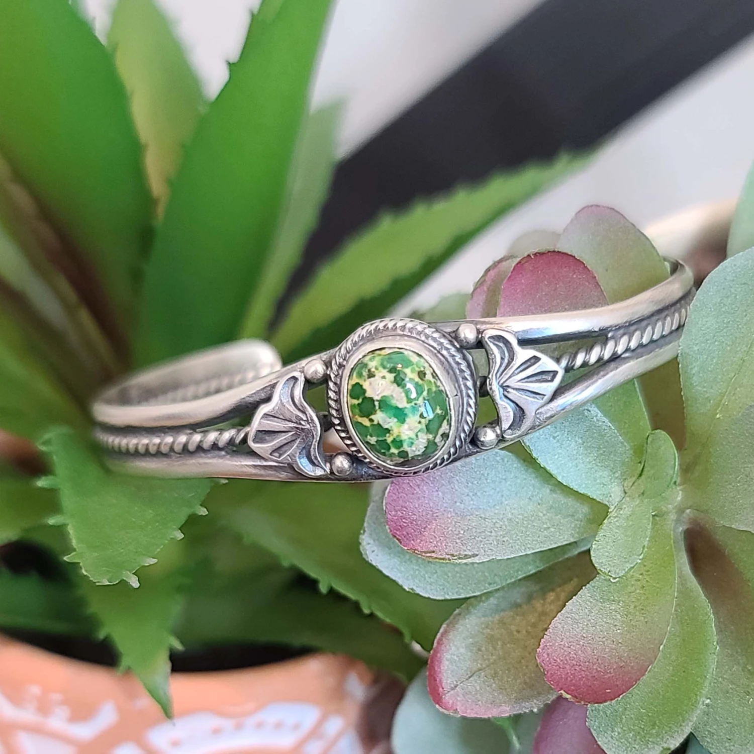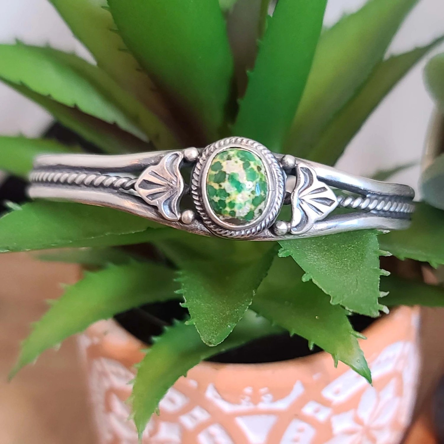 This is a cute dainty green turquoise cuff. There is so much detail in the silver work on this cuff.