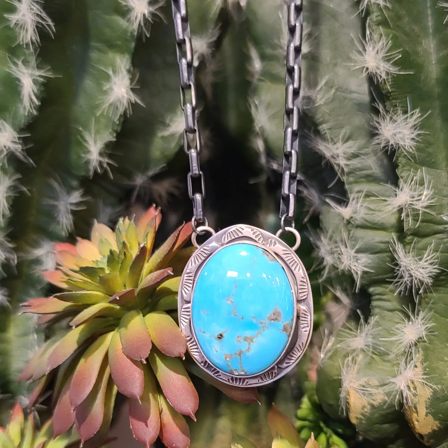 Such a pretty yet simple piece. This Kingman turquoise necklace by Greg Perry is simple beauty at its best.