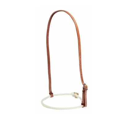 Applies pressure when horse opens its mouth. Nylon lariat rope nose. Hermann Oak harness leather headstrap.