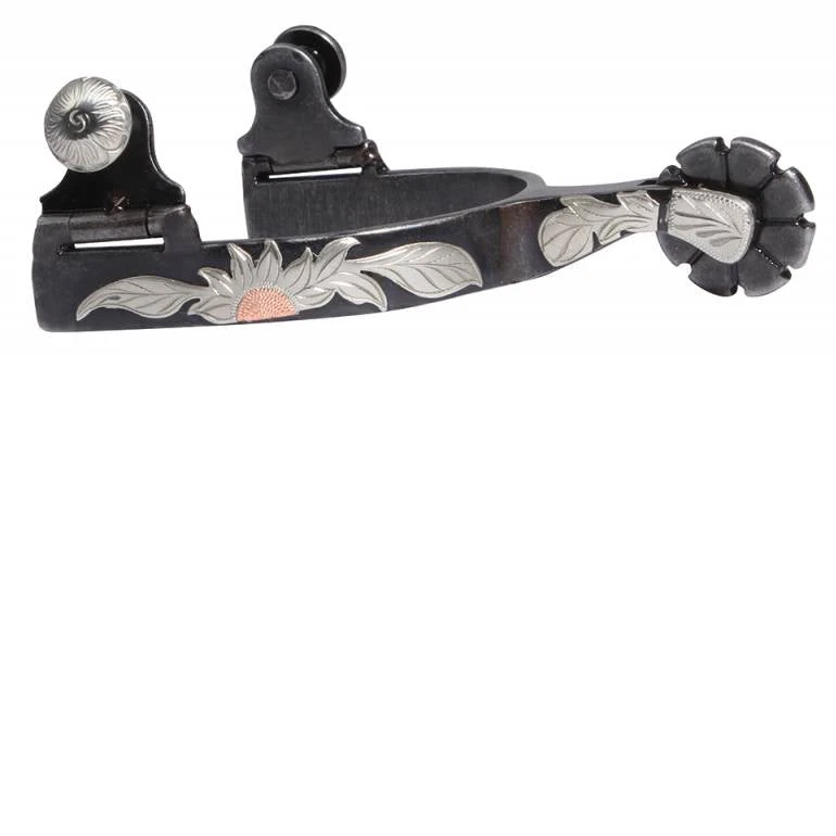 These Professional’s Choice spurs are beautiful handcrafted with a sunflower design on the 1/2″ band, with a blunt 8 point rowel.
