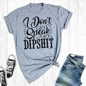 Light grey crew neck tee with solid black graphic that says I DON’T SPEAK DIPSHIT. Here’s a tell it like it is tee!