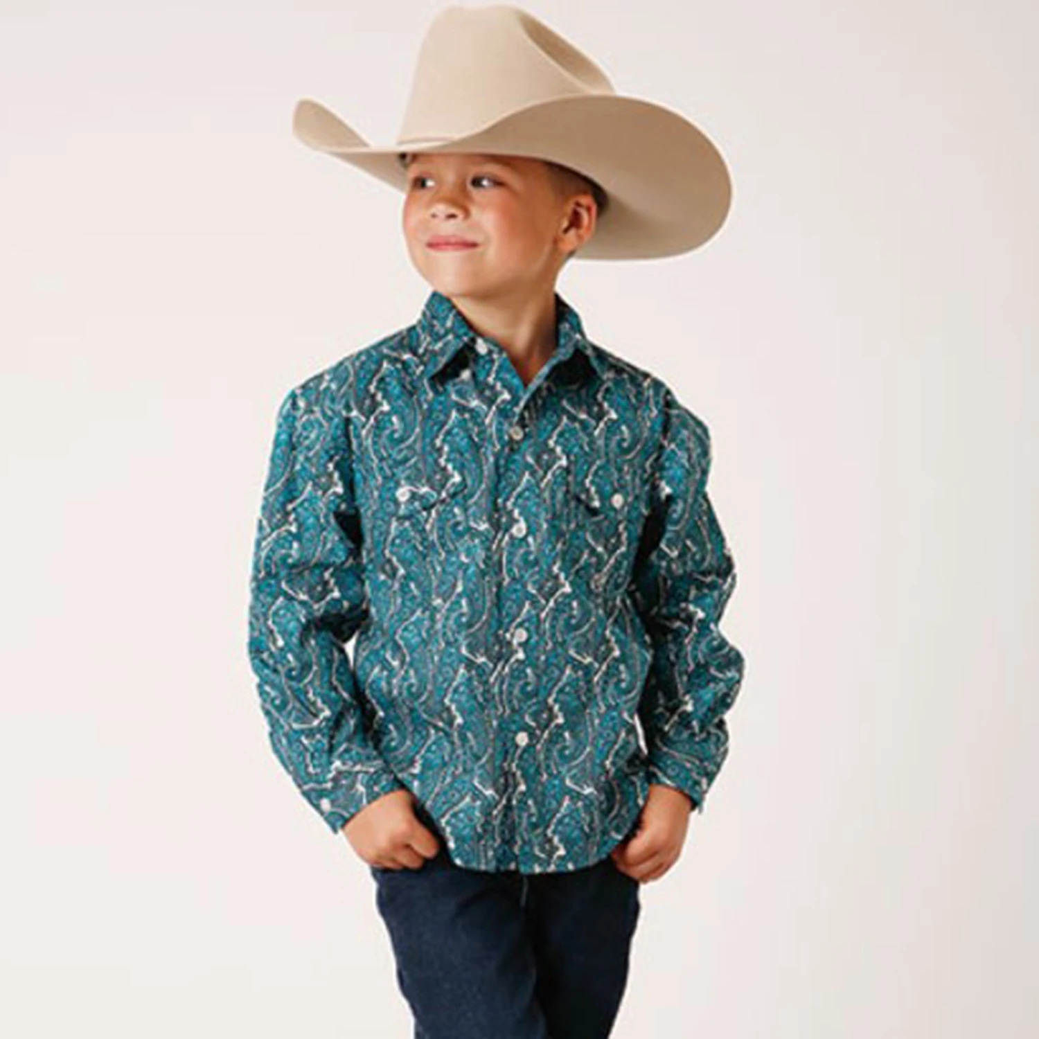 This good looking turquoise paisley print Roper long sleeve shirt will have your cowboy looking sharp.