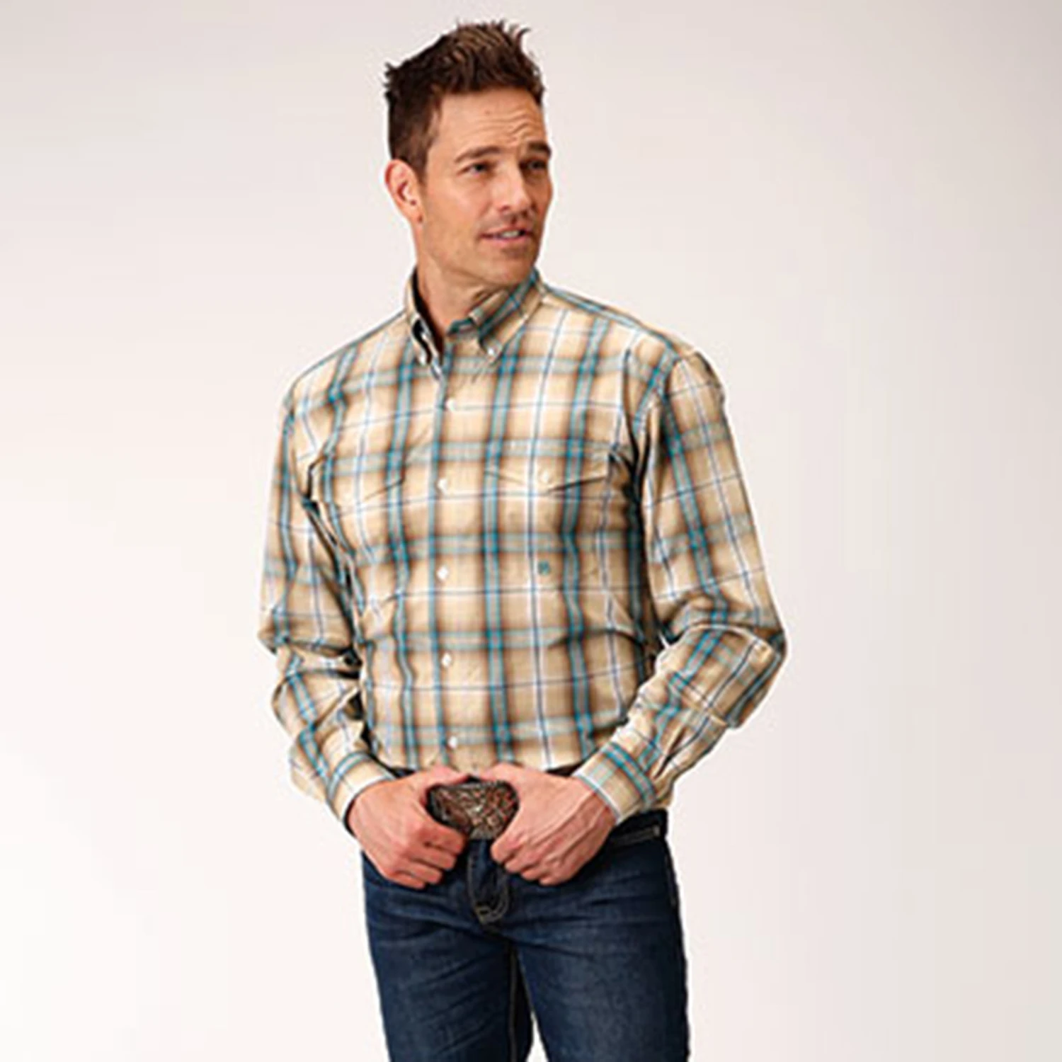 This khaki blue and tan plaid long sleeve from Roper is perfect for wearing to church on Sunday or durable enough to take on whatever work comes your way. It features a back yoke with pleat and locker loop, has buttons down the front, on the cuffs, and the collar. It has two front pockets, with the left front chest featuring the famous Roper “R” brand embroidered on it.