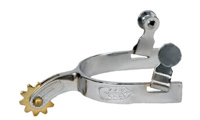 Youth chrome plated spurs with engraved leaf design. Spur details: 1/2″ band, 1 3/4″ shank including 10 point brass rowel and 2 1/2″ boot opening.