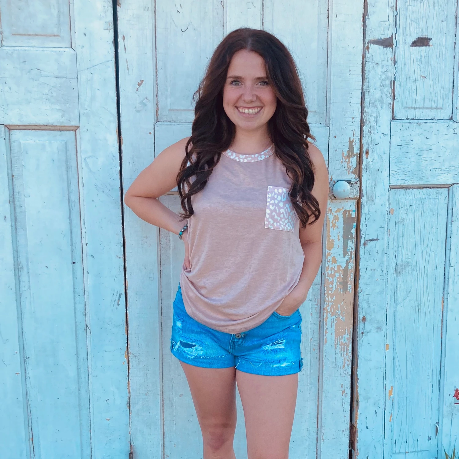 This blush animal print tank is so flattering! It features the animal print around the neckline and around the arm area.