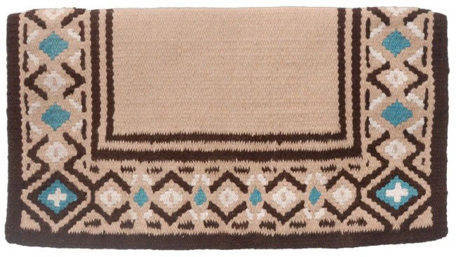 This tan and teal diamond design saddle blanket is 100% heavyweight wool. It measures 36″ x 34″.
