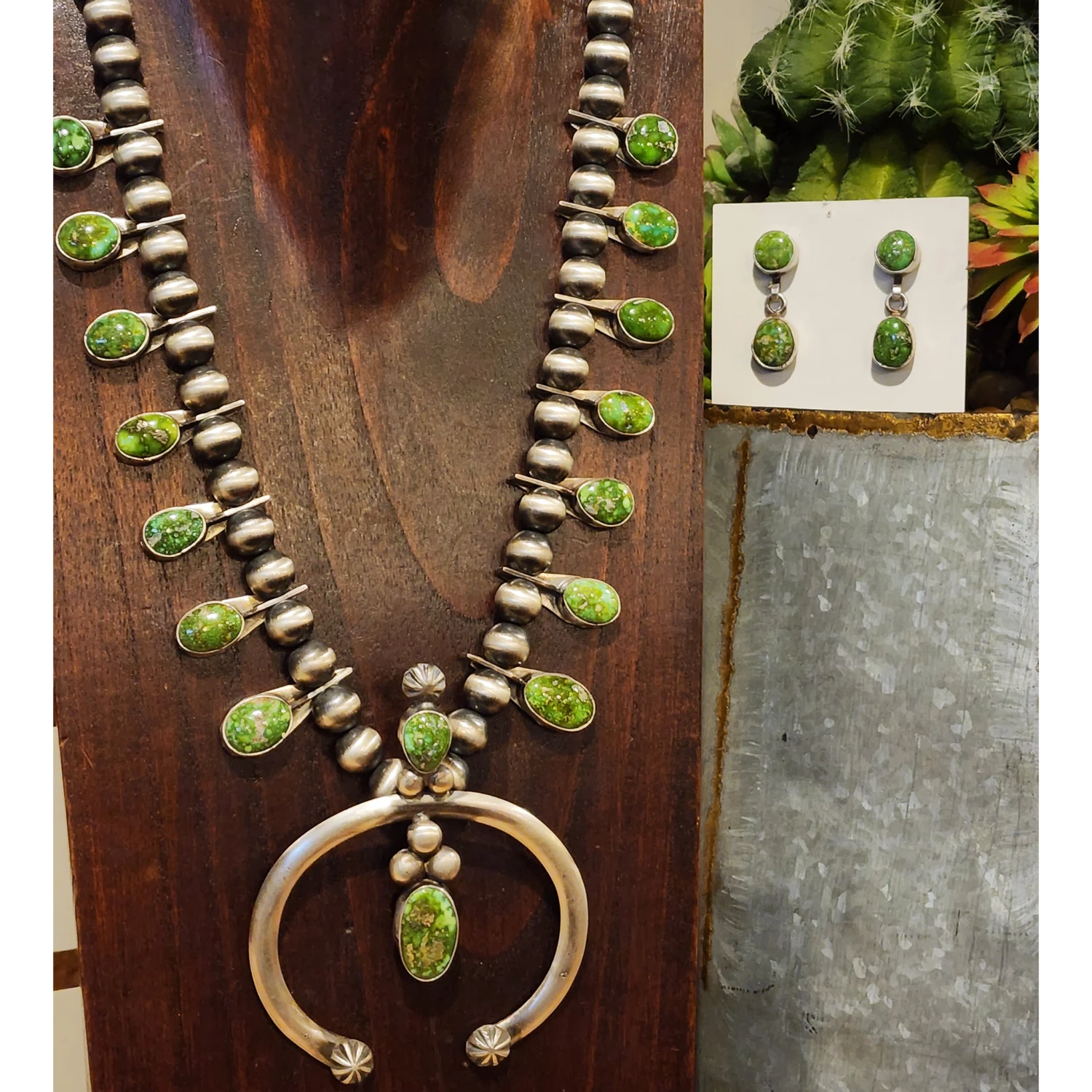 This stunning Sonoran Gold squash blossom is so eye catching and unique. Each stone on this squash is more beautiful than the last. The matching 2 stone earrings are just as beautiful and adds that extra touch to this already beautiful piece. The Naja is 3 inches by 3 inches.