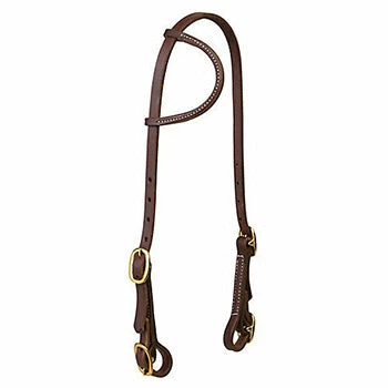 Extra heavy harness leather is dipped in oil, dressed with saddle butter and hand rubbed for the ultimate in performance and a rich golden chestnut color. This easy-to-position 5/8″ sliding ear headstall features lower buckle placement for your horse’s comfort and buckle bit ends for easy bit changes. Ideal for trail, working, and everyday use. Non-rust solid brass hardware.