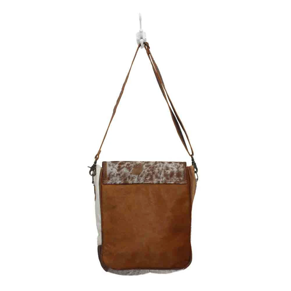This cross body purse has an adjustable leather strap and authentic tan and white hide! We love the look of the over the top cover!