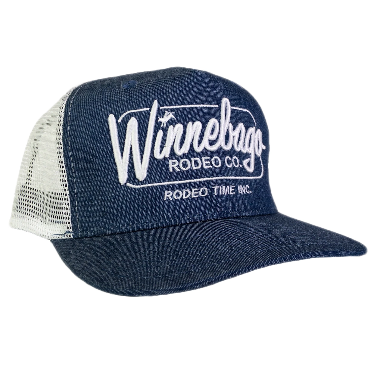 Winnebago Rodeo Co. Denim and White Mesh Back, Flat Bill Cap.