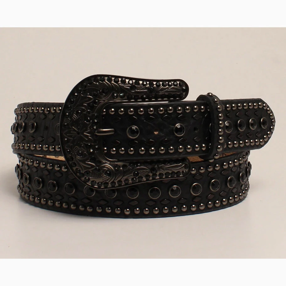 This women’s belt is all black and features a faux snake material! Black crystals run down the center followed by smaller ones on the sides!