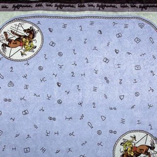 This limited edition wild rag is a slate blue color with brands throughout. Bucking horses are found in the corners followed with a rope border.