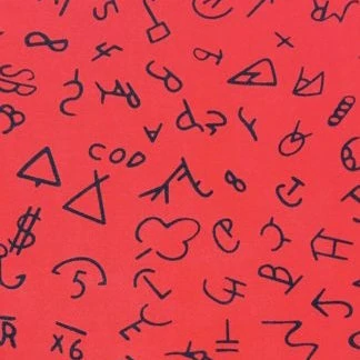 This red wild rag has a multitude of black brands all throughout.