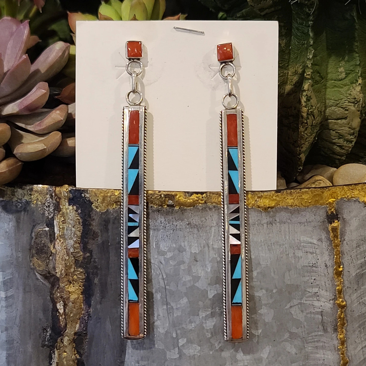 Can we just say STUNNING! These Zuni inlay long dangles are perfection. They are a post style earring that features coral, turquoise, black onyx & mother of pearl.